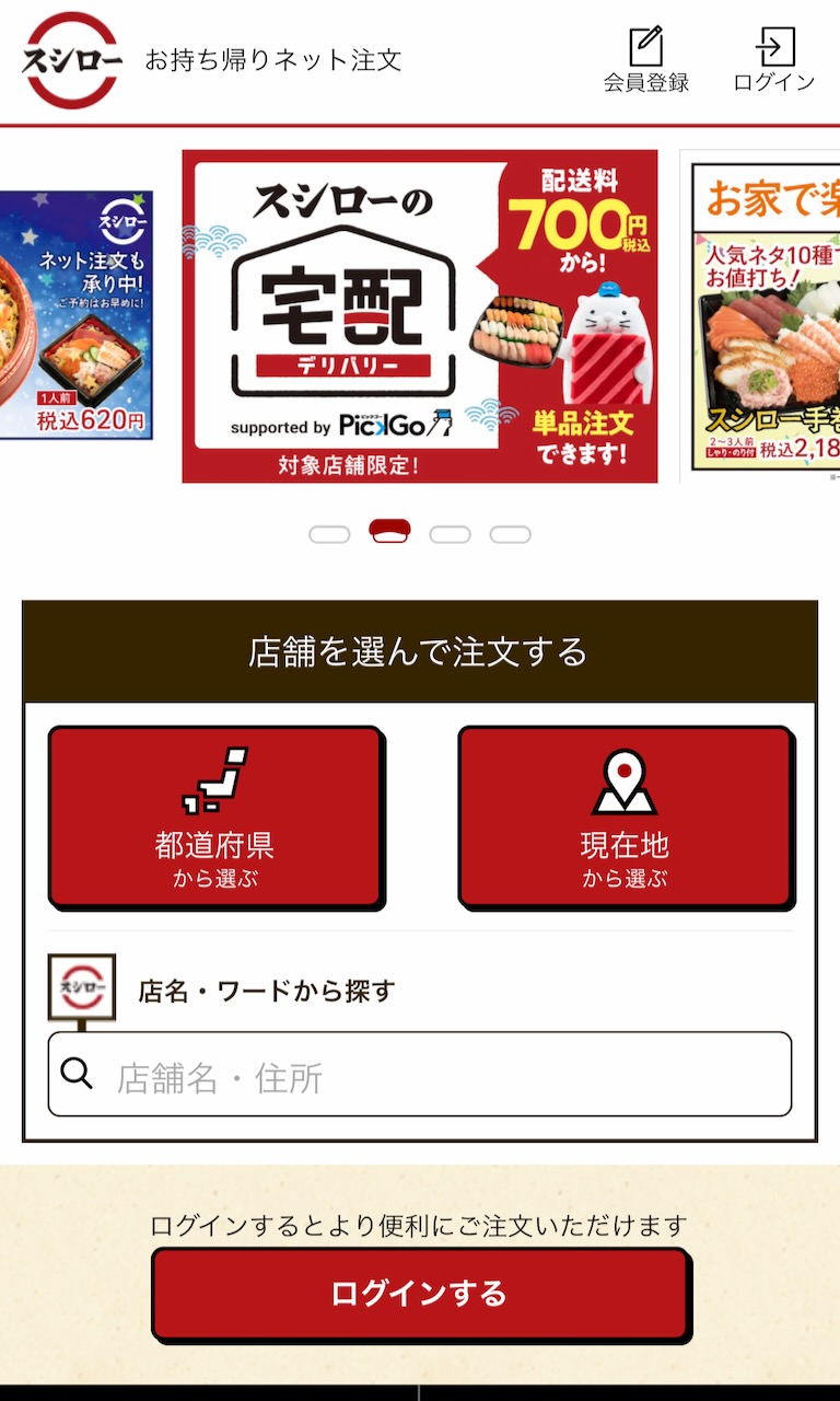 アプリやブラウザからお持ち帰りネット注文にアクセスして、店舗を選択します。ログインはしなくても大丈夫。
