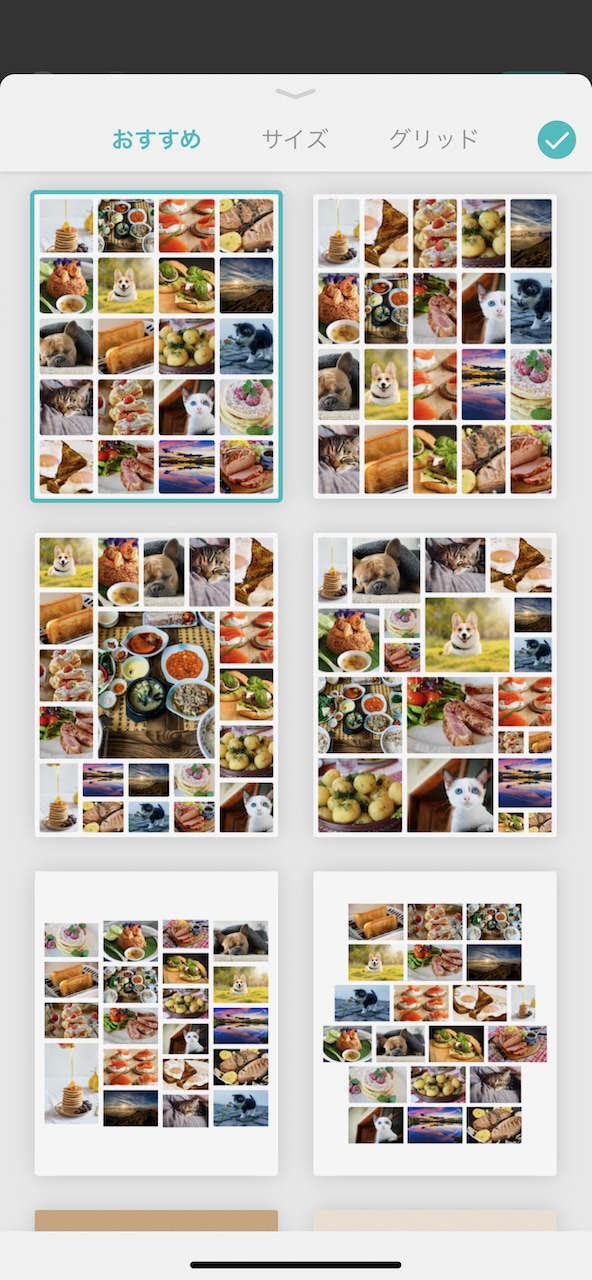 「Pic Collage」はシンプルなコラージュを作るのに特化しています。選んだ画像数にあわせて、正方形&長方形を組み合わせたシンプルなフレームのコラージュパターンを多数用意してくれるんです。スマホゲームのプレイ記録やガチャ結果のスクショなどをまとめて載せたい時にもかなり便利。