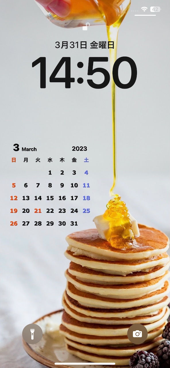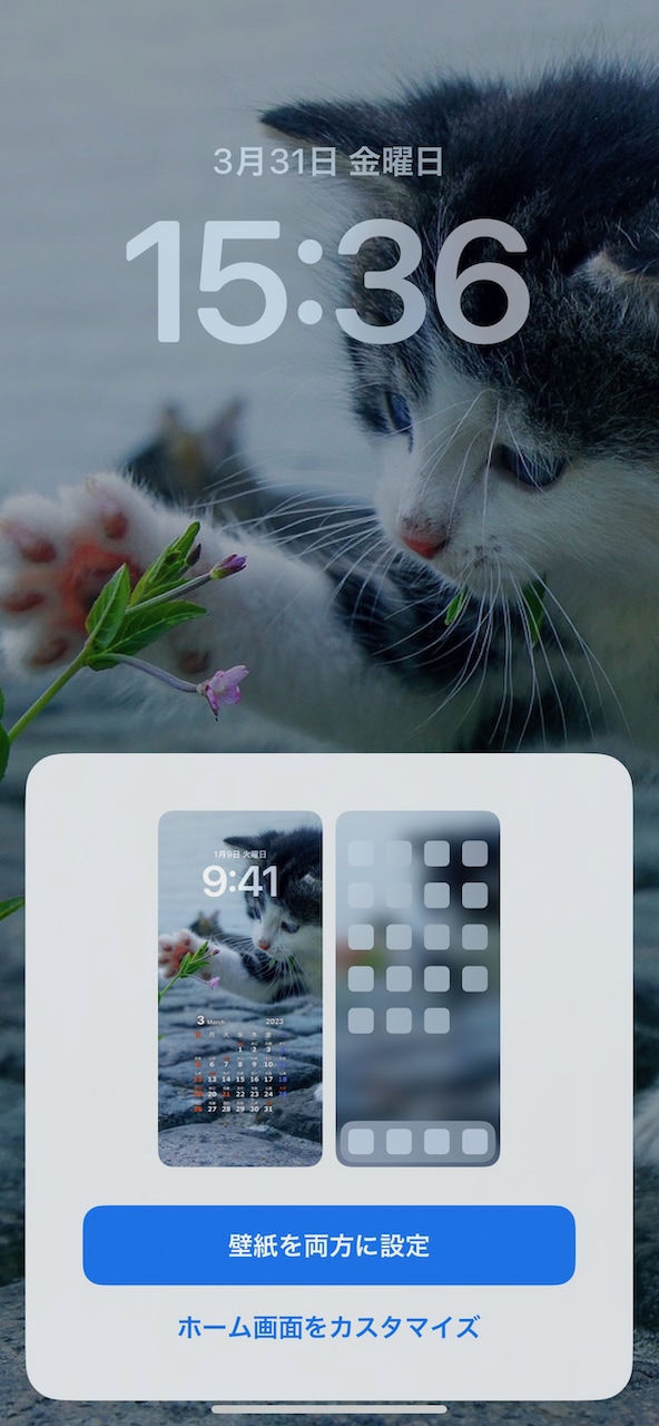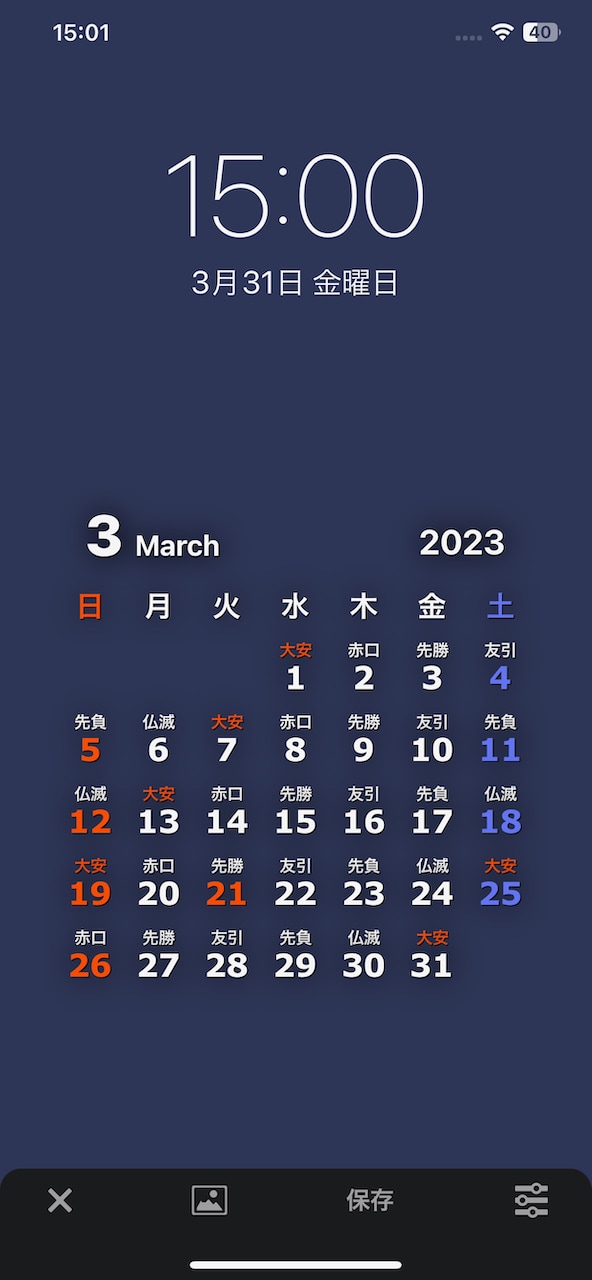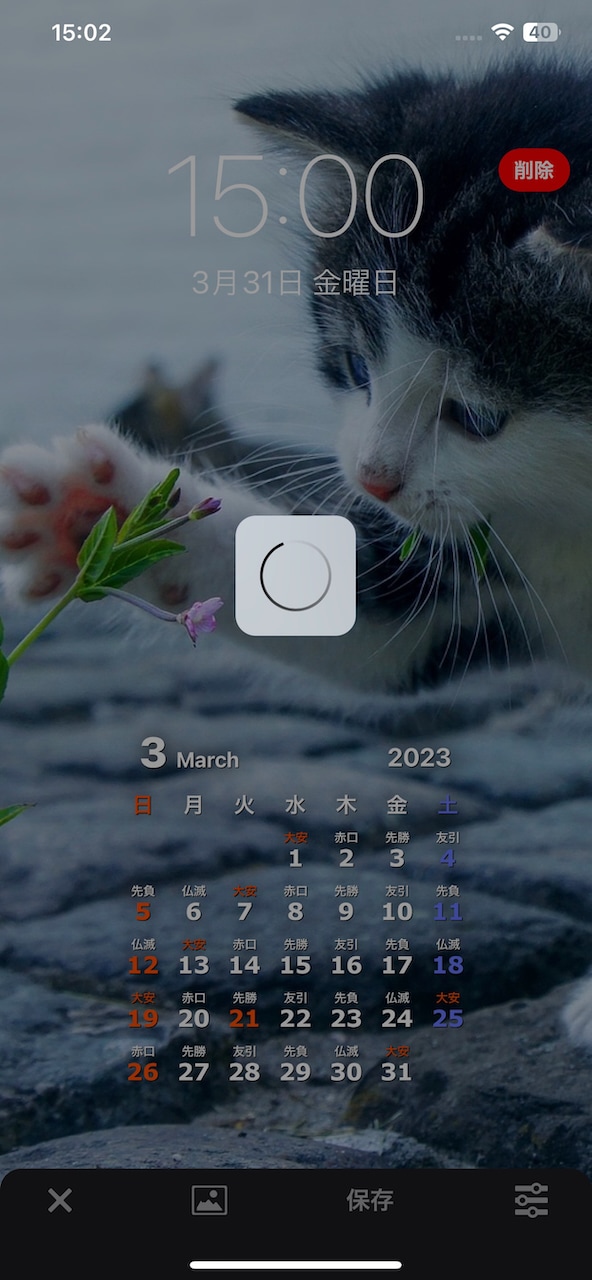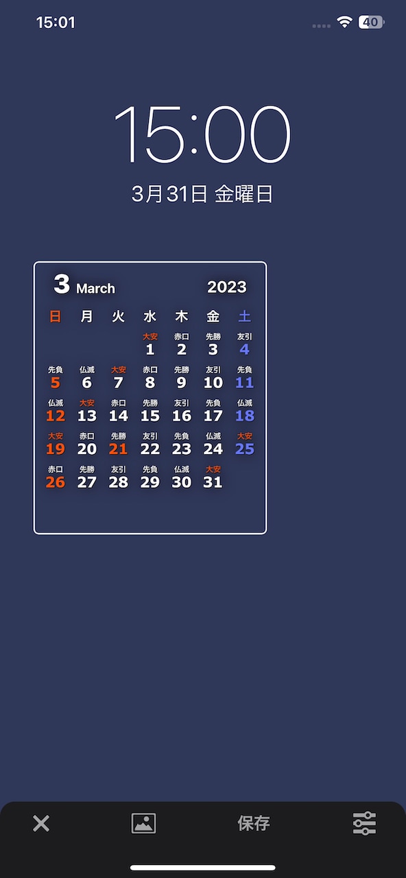 壁紙が完成したら、「保存」をタップ。「写真」アプリから壁紙に設定すると、ロック画面にカレンダー付きの壁紙が表示されます。