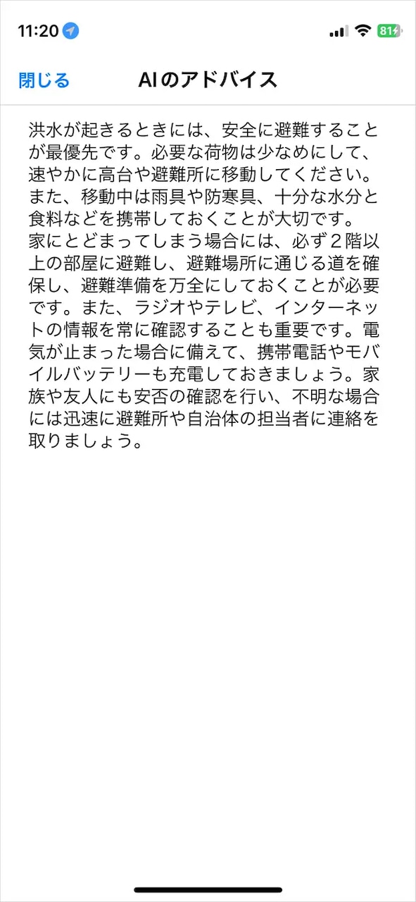 今回のアップデートにより、防災情報に対するAIアドバイスが追加され、ユーザーはより効果的な防災情報を得ることができるようになりました。これにより、避難所や避難場所の自動検索、ハザードマップの表示といった既存の機能と併せて、より簡単かつ効果的な防災情報を提供することができます。これは、防災に対する意識を高め、安全な行動を促すための大きな一歩となるでしょう。