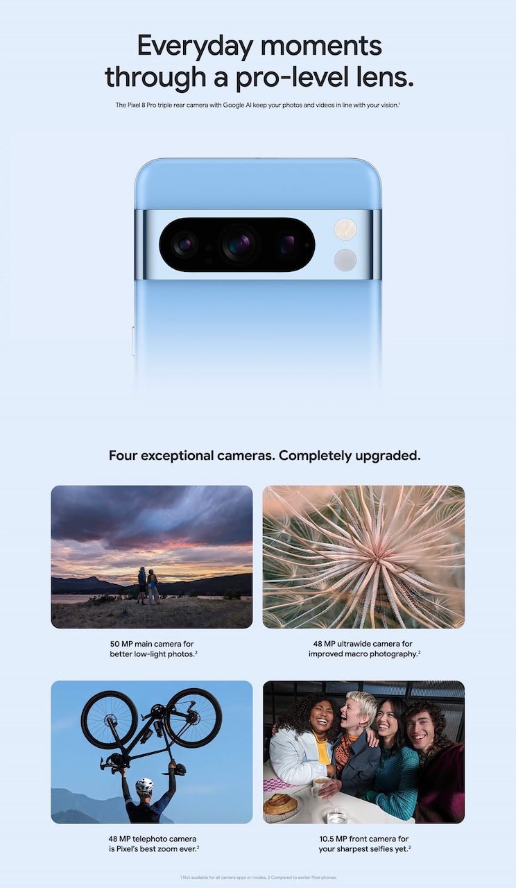 Androidリーカーのカミラ・ヴォイチェホフスカ氏(@Za_Raczke)が、「Pixel 8」と「Pixel 8 Pro」の製品ページとされる画像をリークしました。以下はリークされた「Pixel 8 Pro」の製品ページの一部です。
