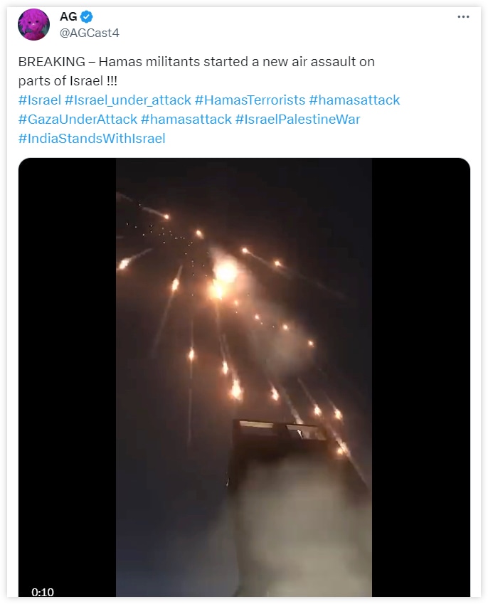 以下は「ハマスがイスラエルに向けて発射したロケット弾」「ハマス過激派の軍事車列がイスラエルのミサイルの標的にされている様子」としたフェイク投稿。実際はどちらもシリアで撮影され、2019年に投稿されたものです。