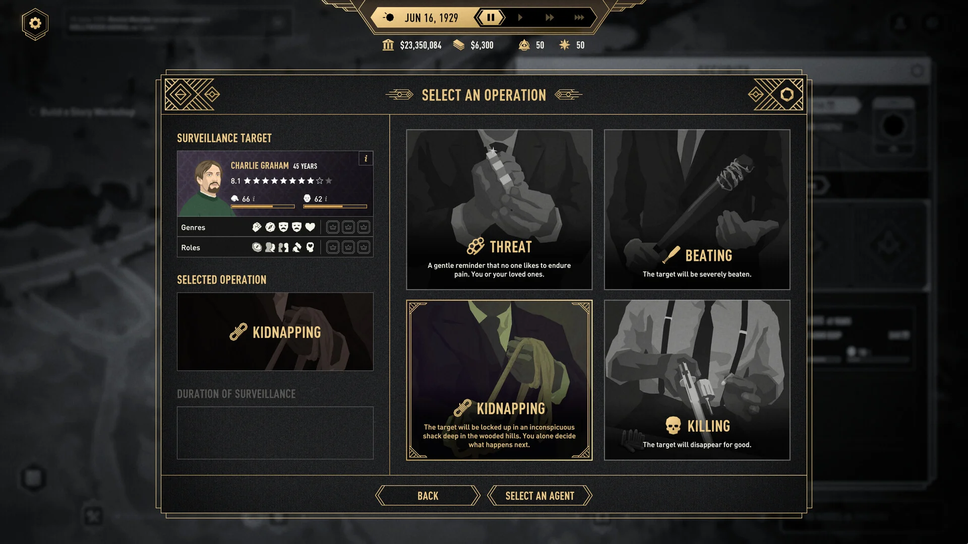 本作では映画製作の美しい側面だけでなく、スキャンダルや秘密工作といったダークな要素も重要な要素として描かれています。スター女優の窃盗事件のような突発的なトラブルへの対処から、競合他社への脅迫や暴力といった非合法な手段まで、プレイヤーは自身の良心とビジネスでの成功を天秤にかけながら決断を下していくことになります。
