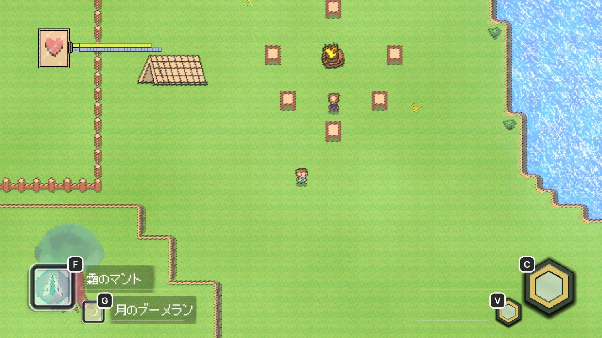 本作では広大なフィールドを自由に探索することができます。美しいピクセルアート調のグラフィックで描かれた世界には、緑豊かな平原から水辺まで多彩な環境が用意されており、それぞれに異なる発見や挑戦が待っています。
