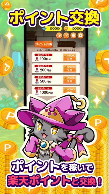 『ポイ活にゃんこと魔法のダンジョン』最大の魅力は、ゲーム内で貯めたポイントを楽天ポイントに交換できる点です。