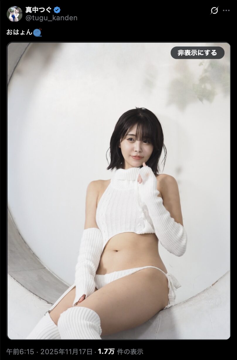 コスプレイヤーの真中つぐさんが11月17日、「おはょん」という可愛らしい朝の挨拶とともに、白いニット姿の写真をXで投稿しました。